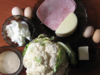 6. Puneti restul de conopida, restul din compozitia de oua si sunca ramasa, apoi presarati cascaval.