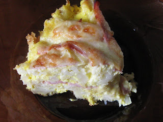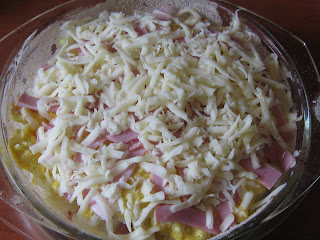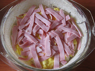 5. Continuati cu jumatate din compozitia de oua si 2/3 din sunca feliata.