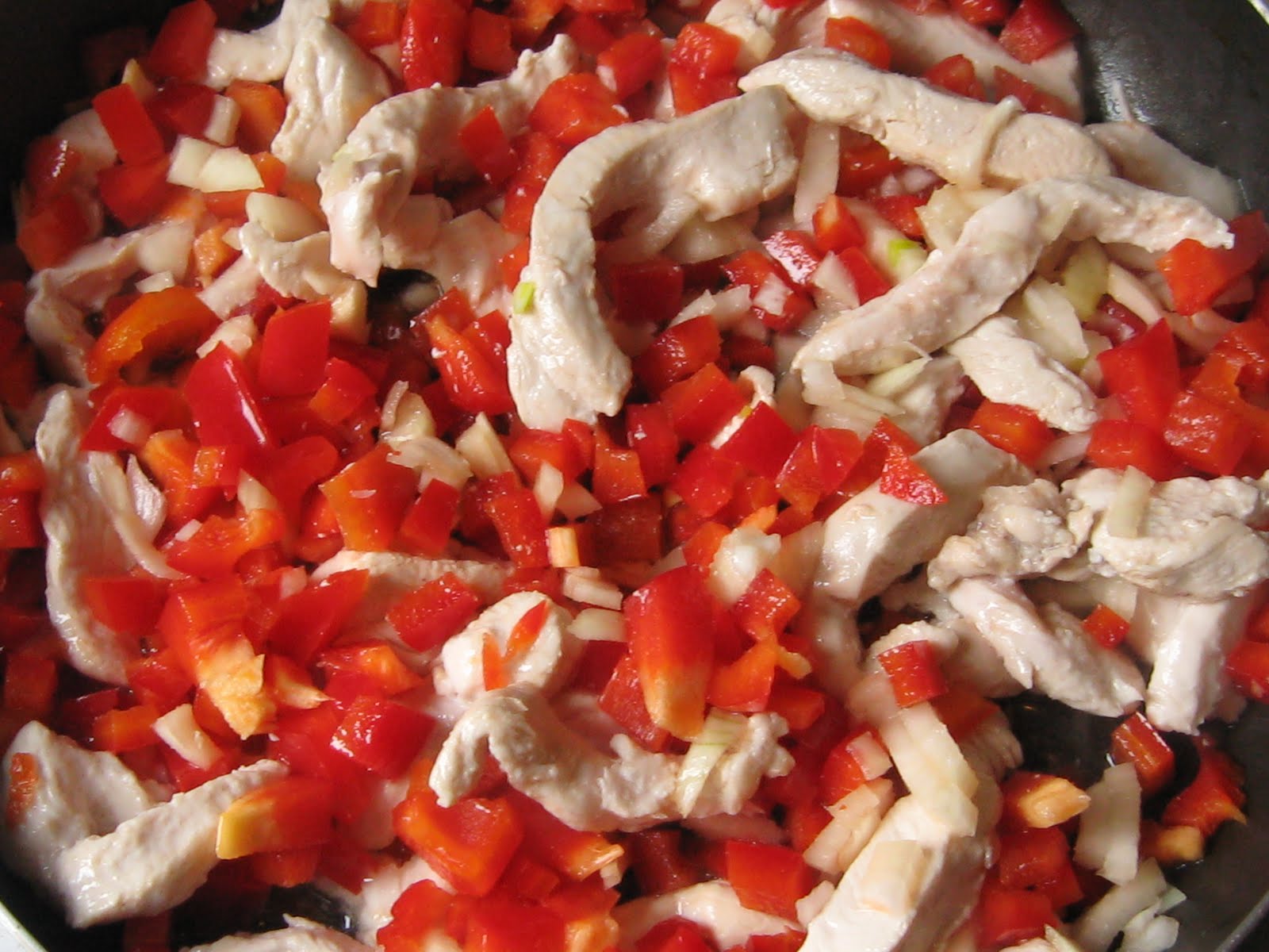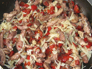 4. Intr-o tigaie mai mare prajiti carnea taiata fasii, ardeiul si ceapa taiate cubulete. Condimentati cu sare, piper si marar uscat. Puneti un pahar de vin si lasati pana se rumeneste carnea.